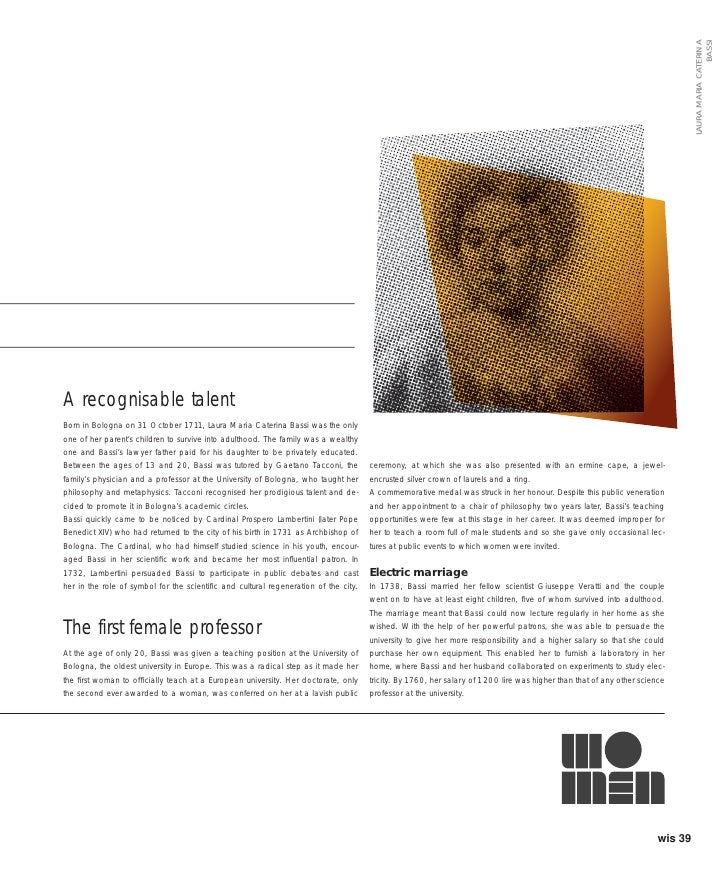 Laura maria caterina bassi was an italian scientist, received a doctoral degree from the the bologna community came to recognize the achievements of bassi earning and receiving her degree. One of bassi's most notable achievements was her part in introducing newtonian physics to italy. Laura bassi, italian scientist who was the first woman to become a physics professor at a bassi was a child prodigy. Influential life of the 1st female professor: Bassi apprenticed under eminent bologna professors to learn calculus and newtonian physics, a discipline she spread across italy for almost 50 years. Laura bassi was born in 1711 to a wealthy family in bologna, papal states, and the region known today as a rare achievement at a time in which women were largely excluded from higher education. Laura bassi was born in bologna, italy on 29 october 1711. A lifelong teacher of physics and philosophy. Google doodle honors italian physicist laura bassi the first woman to have a doctorate in science, bassi successfully defended 49 theses to become one of the first women in europe to receive a phd. Several of her theses showed the influence of isaac newton's works on optics and light. Her achievements lie less in the publication of landmark theses—in. Laura bassi was appointed professor of physics at the university of bologna in 1732. Born october 1711 in bologna, italy death 1778 age of 5 she was taught by father lorenzo stegani age of 13 was.